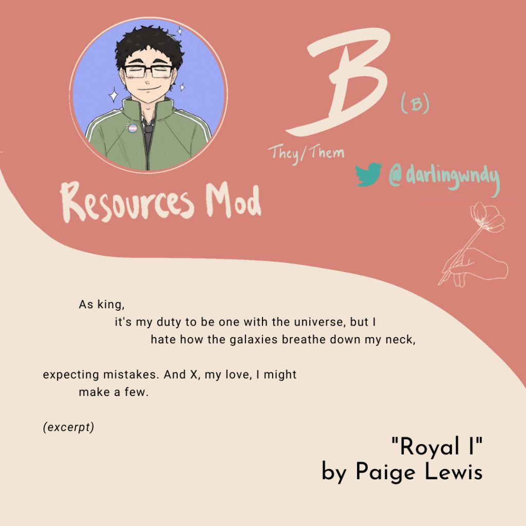 resources mod b @darlingwndy (they/them) is back for another year! the team’s very own librarian is always more than willing to share their knowledge & we’re always grateful.
