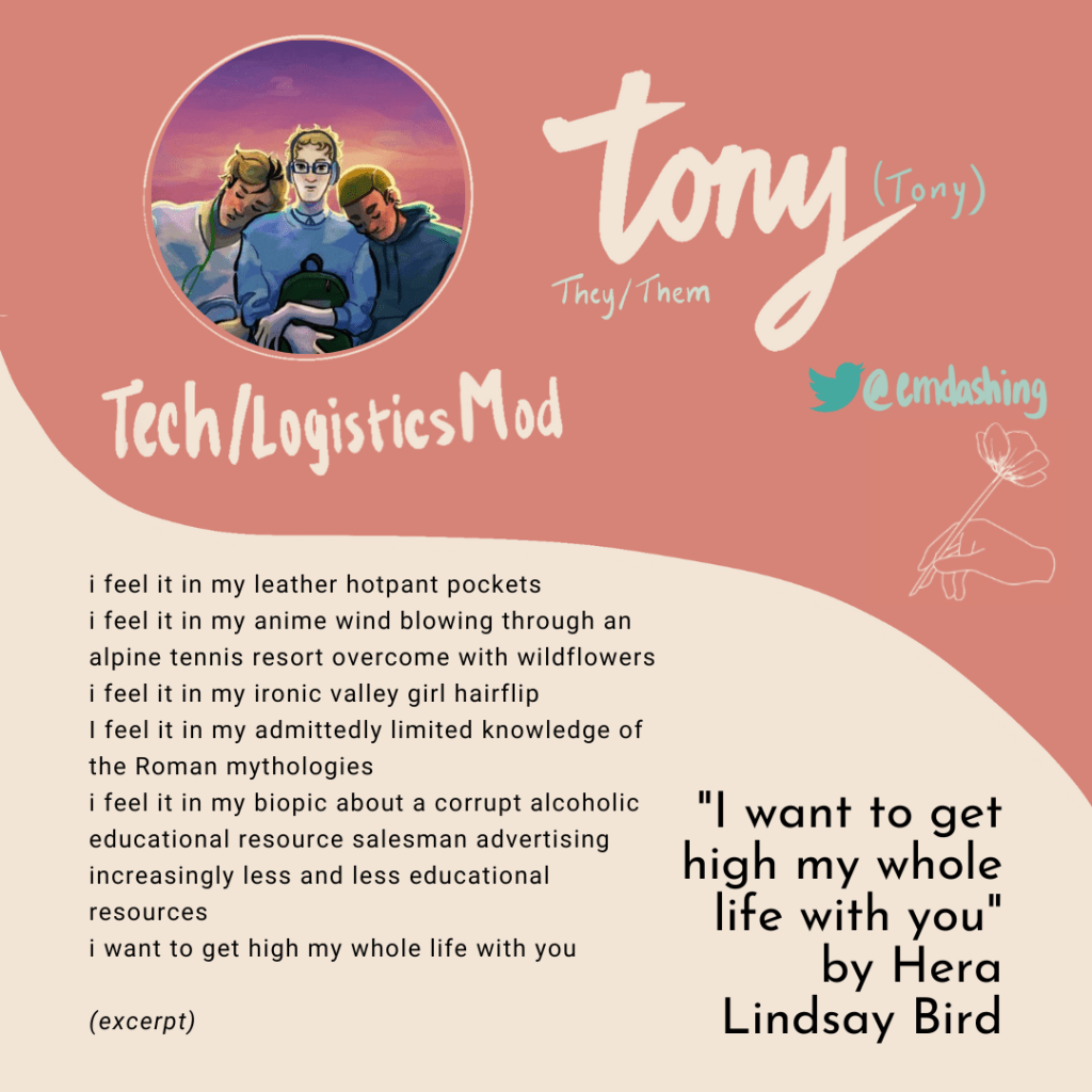 our brand new website is all thanks to tech/logistics mod tony @emdashing (they/them), who’s worked hard to make this year’s event not only possible, but better!